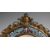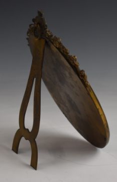 19thC champlevé enamel bevelled glass easel back bronze mirror with scrolling garland finial, 16x22.5cm