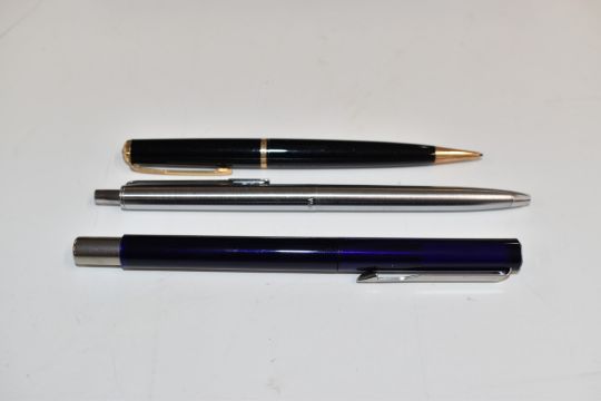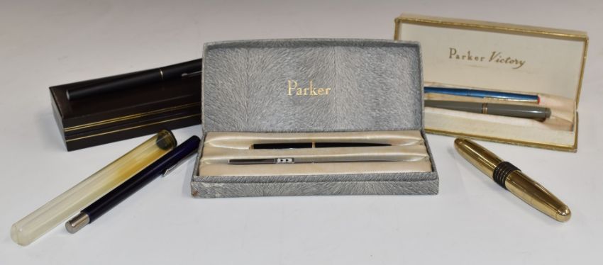 Seven various fountain and ballpoint pens and propelling pencils including Parker Victory, Sheaffer, Benson & Hedges advertising example etc, some in original boxes.