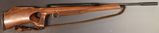 Air Arms Khamsin .22 side lever air rifle with chequered thumb hole grip, raised cheek piece, leather sling and sound moderator, NVSN.