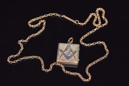 A 9ct rose gold necklace made up of faceted links and a 9ct gold Masonic locket, 13.2g