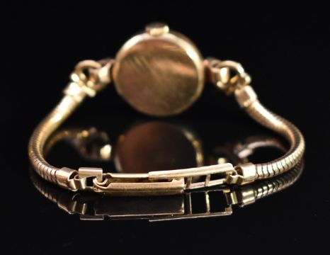 Tissot 9ct gold ladies wristwatch with gold hands and Arabic numerals, champagne dial and signed 15 jewel movement, on 9ct gold bracelet, case diameter 19mm, serial number 856303, 15.7g.