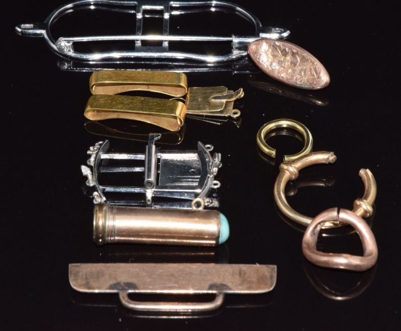 A collection of yellow metal/ white metal jewellery components including clasps, etc