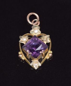 Edwardian 15ct gold pendant in the form of a heart set with an amethyst and seed pearls, 1.6g