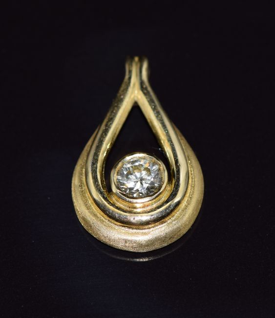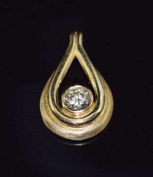 An 18ct gold tear drop pendant set with a round cut diamond of approximately 0.49ct, with certificate