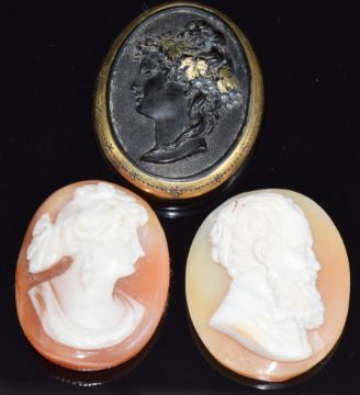 Victorian carved tortoiseshell cameo with gold inlay and border, 2.2 x 3cm and two c1900 cameos depicting a woman and gentleman