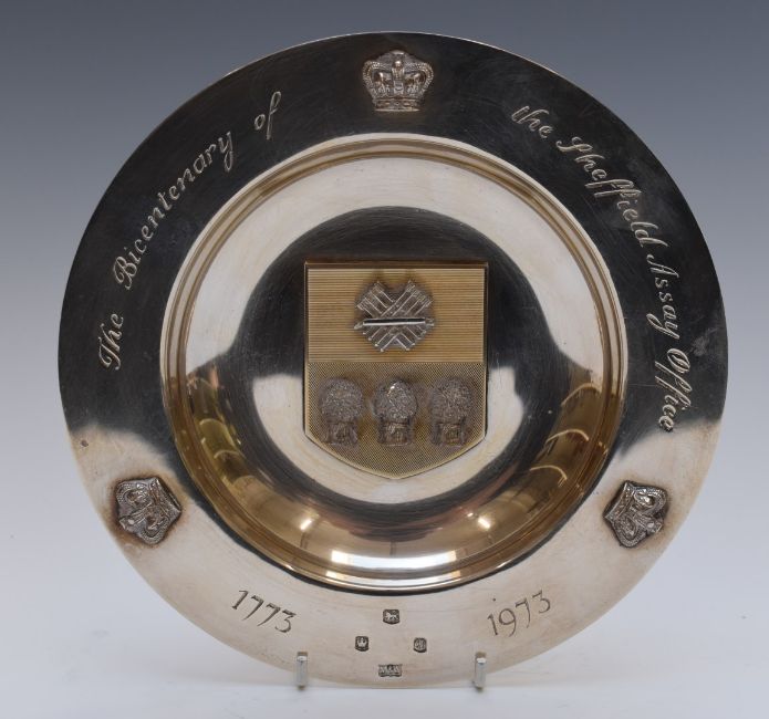 Mappin & Webb feature hallmarked silver commemorative dish celebrating the bicentenary of the Sheffield assay office, Sheffield 1973, diameter 20cm, weight 499g