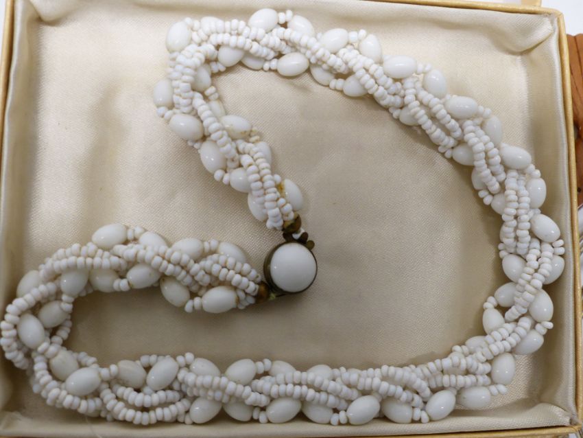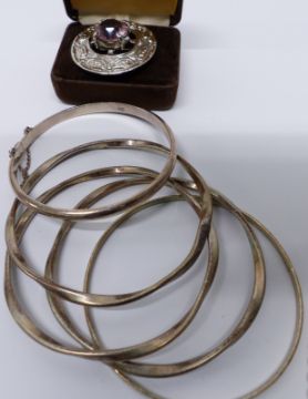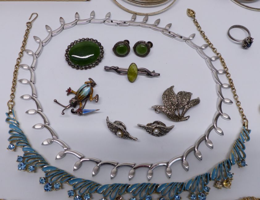 A collection of costume jewellery including pearl necklace, silver bangle, silver brooch depicting a beetle set with enamel and marcasite, 9ct gold charm, silver earrings etc