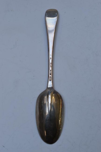 George II bottom hallmarked silver Hanoverian rat tail pattern table spoon, marks indistinct but c1730, maker Joseph Smith I, length 19.5cm, weight 60g