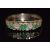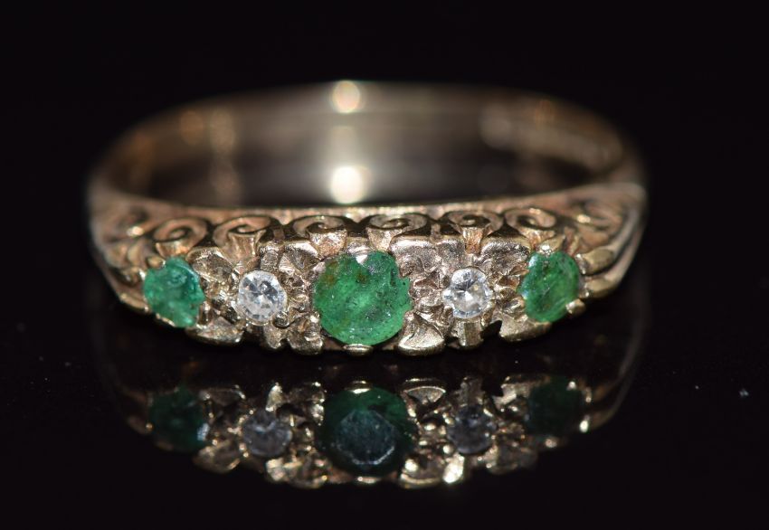 A 9ct gold ring set with round cut emeralds and diamonds in a scrolling setting, 2.4g, size M