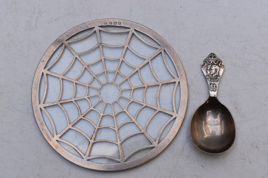 George V hallmarked silver caddy spoon, Sheffield 1934, maker Thomas Bradbury & Sons Ltd, length 9cm, weight 19g, together with a hallmarked silver mounted glass tea pot stand, diameter 13cm