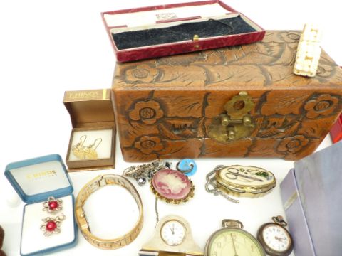A collection of jewellery including vintage necklaces, watches, silver brooch/ pendant set with tiger's eye, etc