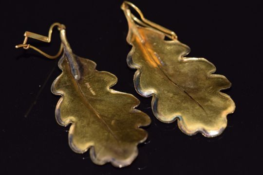 A pair of 14ct gold earrings in the form of an oak leaf with textured decoration, 14g