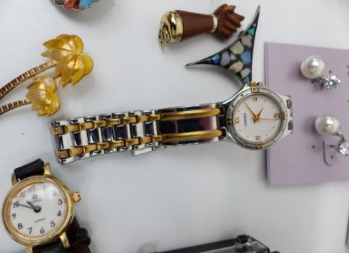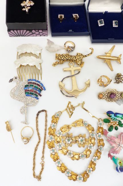 A collection of costume jewellery silver Norway pin, rings including carved coral, mother of pearl and silver, brooches including flamingo, white metal, white metal, opal mosaic brooch and enamel, etc