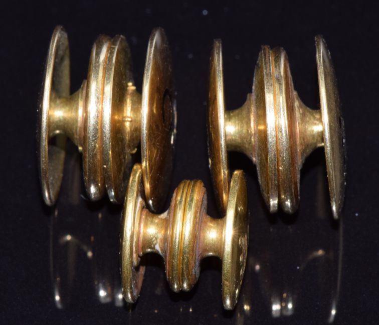 Three yellow metal clip on studs with an initial and crown, the smallest example marked "Kum-A-Part, B & W Co 1923", 35.4g