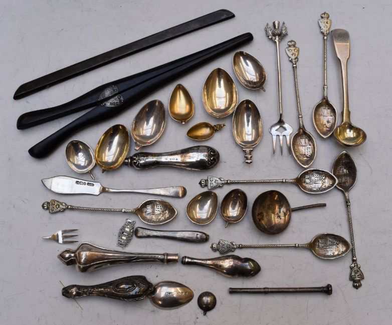 Hallmarked silver and white metal spoons, spoon bowls and a comb back, weight 162g, together with various hallmarked silver handles, propelling pencil etc