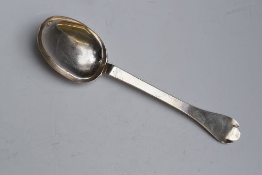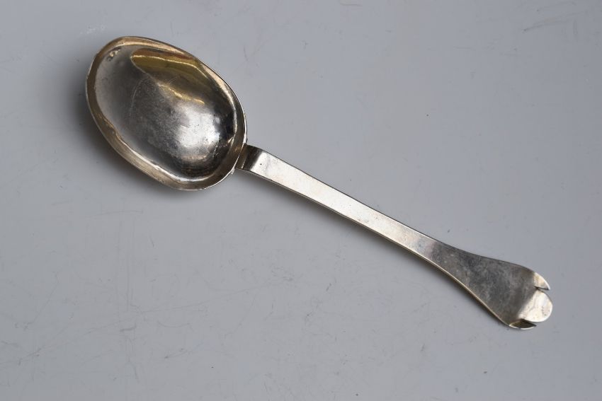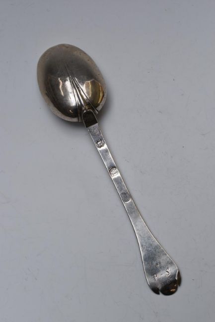 Believed West Country circa late 17thC provincial hallmarked silver treffid or dog nose spoon with rat tail to rear of bowl, with ii maker's mark and engraved to top RS 96, length 20.5cm, weight 41g