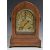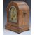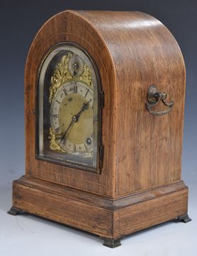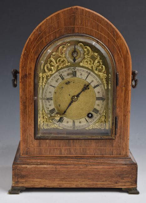 Winterhalder and Hoffmeier mitre cased mantel clock with brass spandreled dial and arch, silvered Roman chapter ring and two train movement striking on two gongs, 33cm tall
