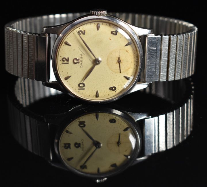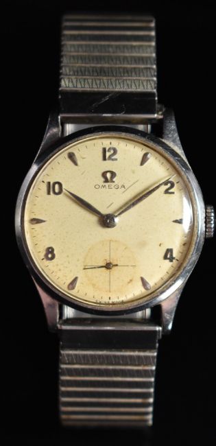 Omega gentleman's wristwatch ref. 13322 with subsidiary seconds dial, steel hands and baton hour markers, champagne dial, stainless steel case and signed 17 jewel calibre 266 movement, on expanding metal bracelet, case diameter 34mm, serial number 14581745.