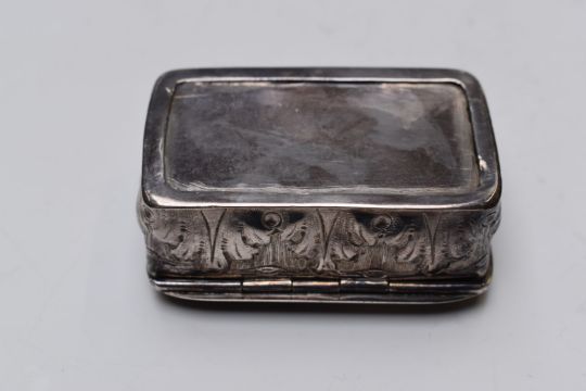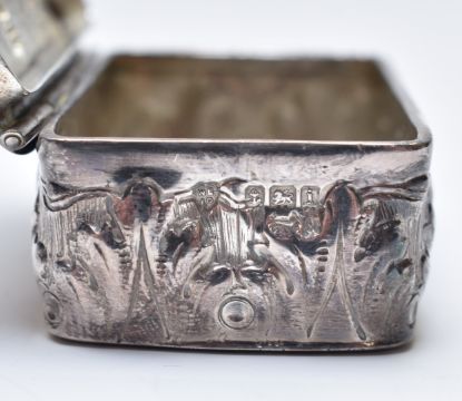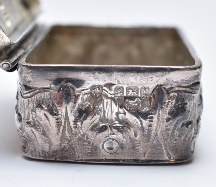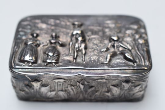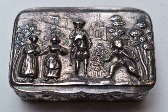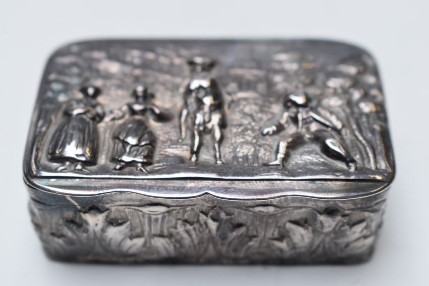 Edward VII hallmarked silver snuff box with embossed scene to lid, Birmingham 1908, maker Williams (Birmingham) Ltd, width 6.5cm, weight 45g