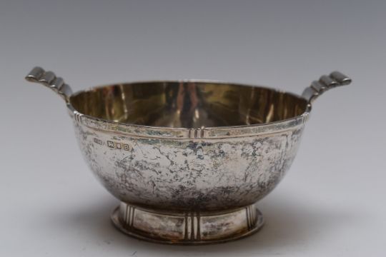 Robert Edgar Stone hallmarked silver Art Deco / Arts and Crafts hammered pedestal porringer or bowl with stepped twin handles, London 1937 with Stone signature and Sorley Glasgow retailer's mark to base, height 7, diameter 11cm, weight 204g