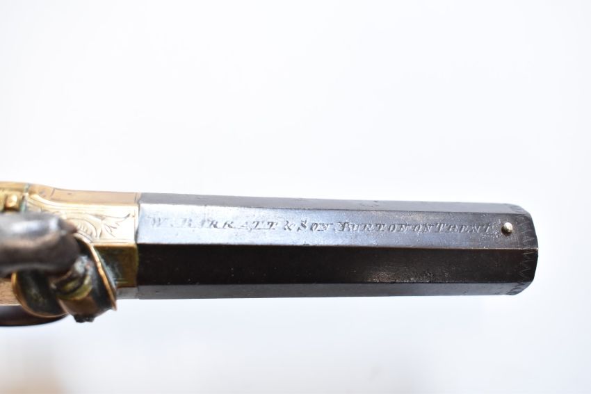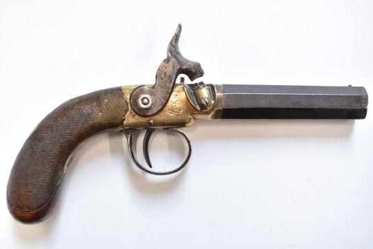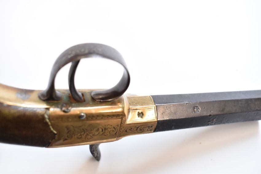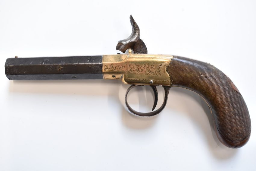 William Butler Barratt & Son of Burton On Trent percussion hammer action pocket pistol with engraved brass lock and frame, chequered grip, vacant cartouche to the wrist and 3 inch smooth bored octagonal barrel, overall length 20.5cm.