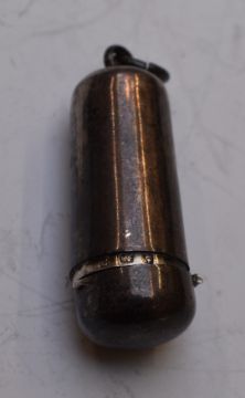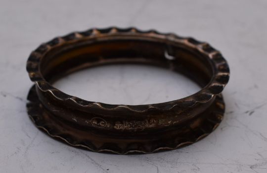 Four various hallmarked silver napkin rings, two white metal shot measures marked 830, Charles Horner hallmarked silver thimble and a hallmarked silver case, weight of all items 143g