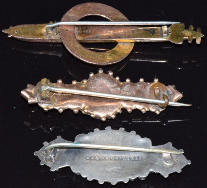 A 9ct gold Royal Navy brooch in the form of a torpedo and lifebuoy, 9ct gold brooch (5.3g) and a Victorian silver brooch