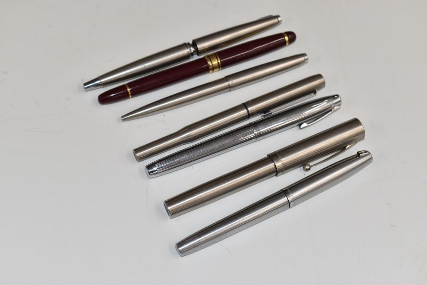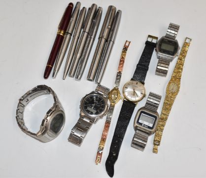Six Parker, Sheaffer and similar fountain pens together with seven various ladies and gentleman's wristwatches including Casio Wave Ceptor and Alarm Chronograph.