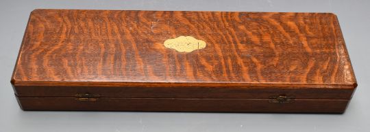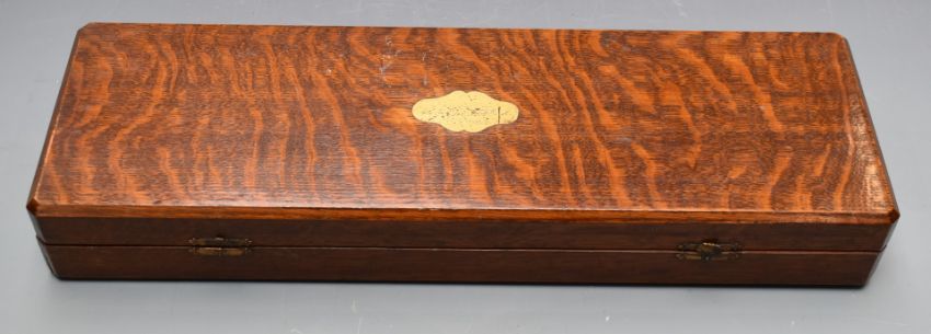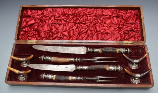 Victorian oak cased carving set with deer horn handles, knife rests, and VR cipher to blades