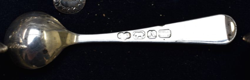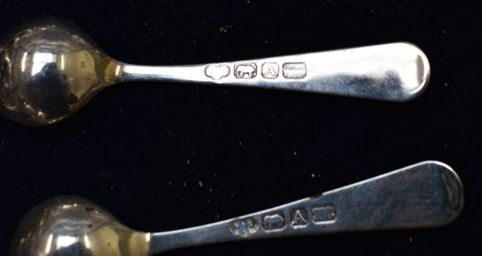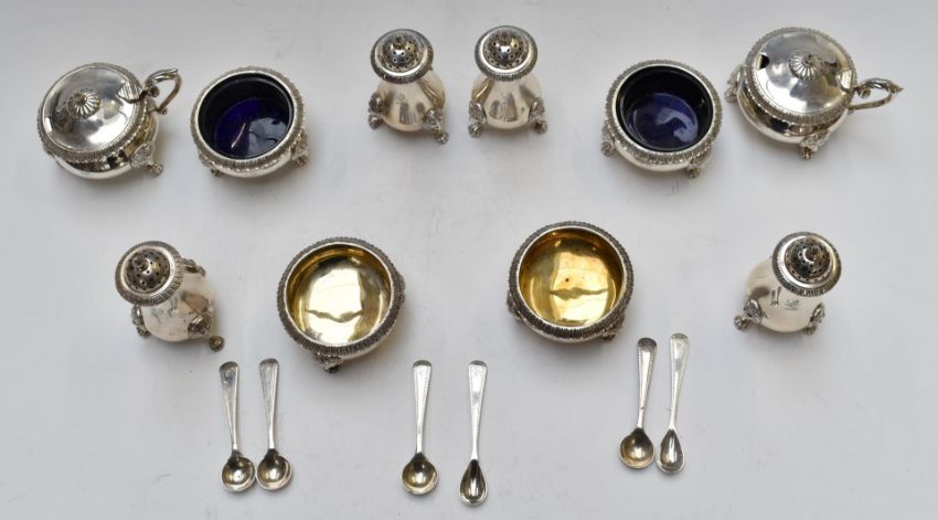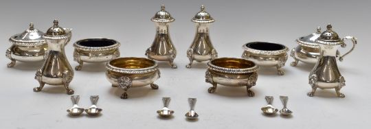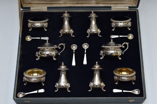 Indian silver cruet set in original fitted case, comprising two each of open salts with blue glass liners, open salts with gilt wash interiors, covered mustard and four peppers, with spoons to match, all with with lion mask decoration and raised on paw feet, c1937 Hamilton and Co, Calcutta, Dehli and Simba, tallest 10cm, weight without liners 1330g, width of fitted case 42.5cm