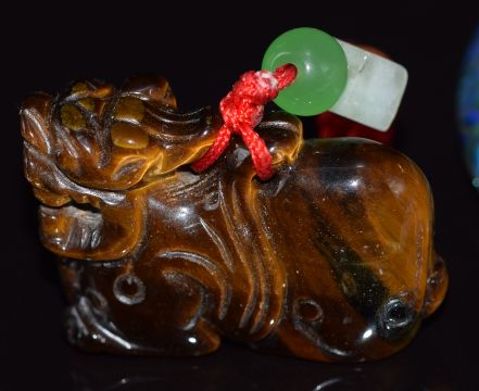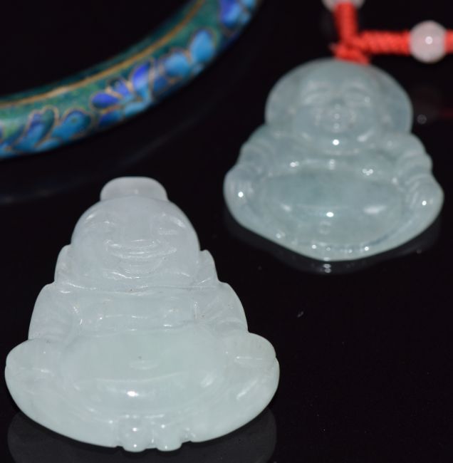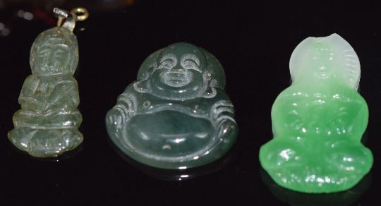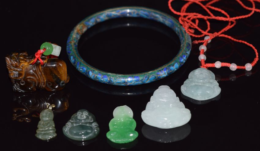 Four jadeite pendants, a tiger's eye Fu dog and a cloisonné bangle