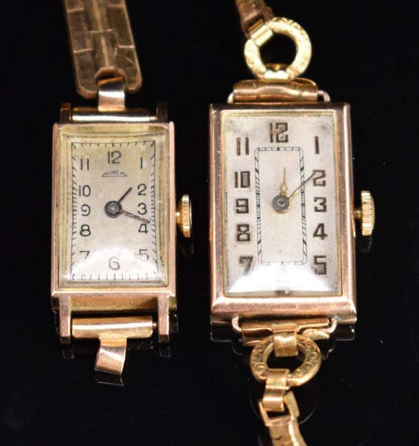 Two Art Deco style 9ct gold ladies wristwatches each with gold hands, Arabic numerals and silver dial, both on gold plated bracelets.