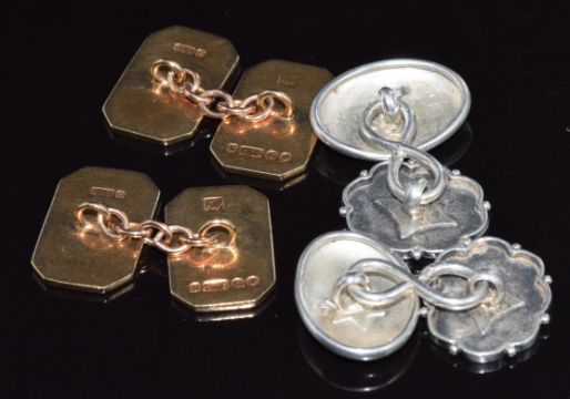 A pair of 9ct gold cufflinks with chequered decoration (9.8g) and a pair of Victorian engraved silver cufflinks