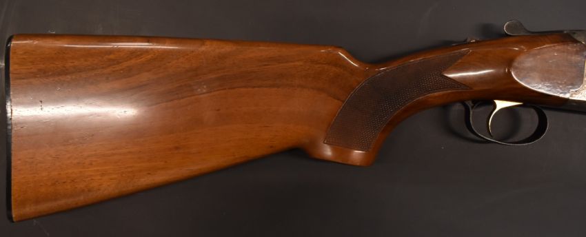 Fias 12 bore over and under ejector shotgun with engraving to the locks, underside, trigger guard, top plate and thumb lever, chequered grip and forend, gilt single trigger, vented top rib and 28 inch barrels choked ¼ and improved cylinder, overall length 113.5cm length of pull 35cm, serial number 91338.  PLEASE NOTE THAT A VALID RELEVANT FIREARMS/SHOTGUN CERTIFICATE IS REQUIRED TO HANDLE/PURCHASE THIS ITEM.