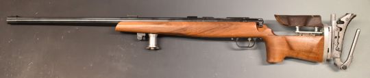 Anschutz model Match 54 .22 bolt-action target or bench rifle with adjustable cheek piece, butt plate and trigger, shaped semi-pistol grip and heavy 27 inch barrel, overall length 110cm, serial number 65935.  PLEASE NOTE THAT A VALID RELEVANT FIREARMS/SHOTGUN CERTIFICATE IS REQUIRED TO HANDLE/PURCHASE THIS ITEM.