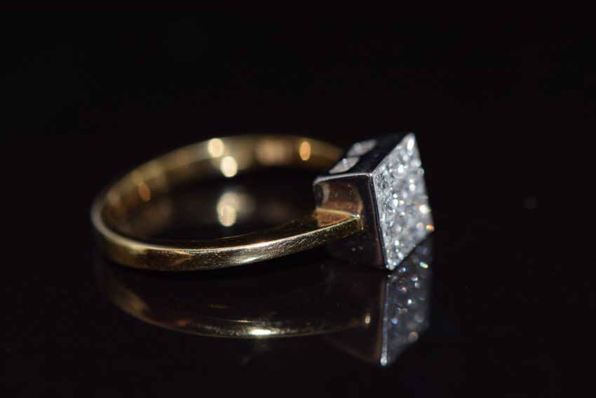 An 18ct gold ring set with 16 princess cut diamonds, total diamond weight approximately 0.5cts, size N, 3.6g