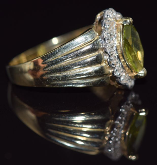 A 9ct gold ring set with a marquise cut peridot surrounded by diamonds, 4.0g, size R
