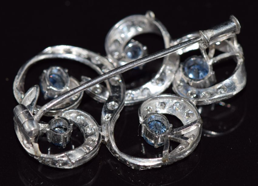 A white gold brooch set with oval cut sapphire and diamonds, 3.8 x 2.8cm, 8.6g