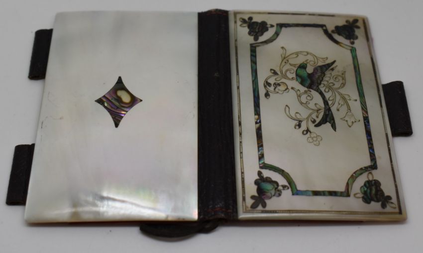 19thC inlaid abalone/mother of pearl ladies dance card holder with bird decoration, silk interior and suspension loop, 9x6.5cm