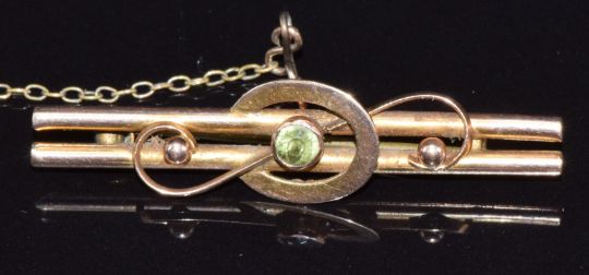 A 9ct gold brooch set with a peridot, 2.4g, 4cm