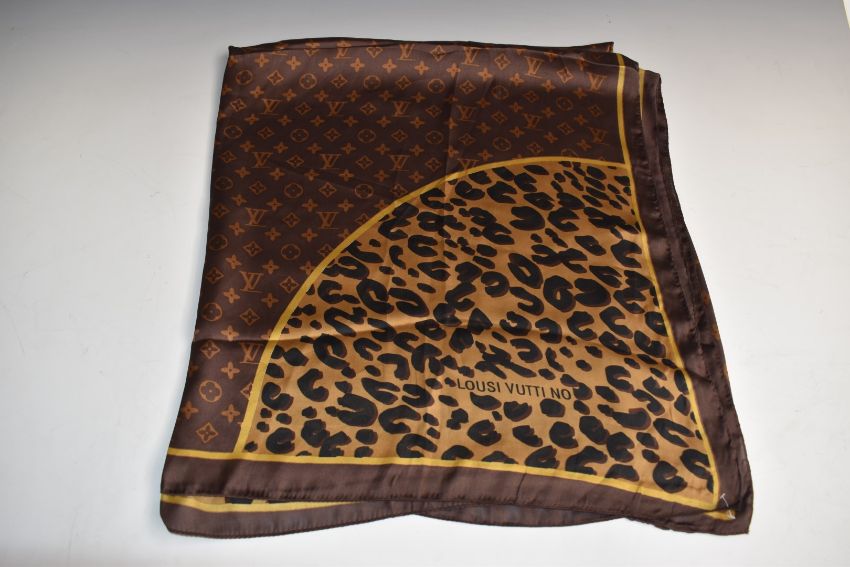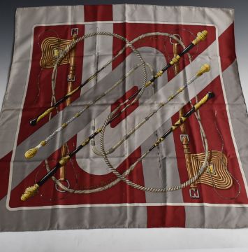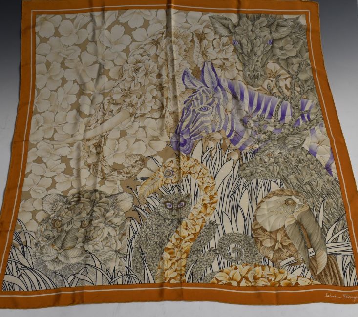 Hermès Paris silk scarf, Louis Vuitton style rectangular silk scarf and a Salvatore Ferragamo example