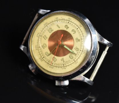 Two vintage gentleman's wristwatches Expert chronograph with luminous hands, red centre seconds hand, Arabic numerals, two-tone dial and nickel plated case and Elco Calendar with date aperture, gold hands, red centre seconds hand Arabic numerals, black dial and nickel plated case, on expanding bracelet, largest case diameter 34mm.