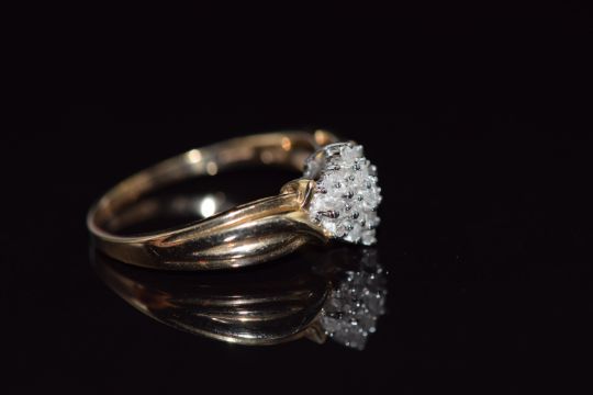 A 9ct gold ring set with diamonds in a cluster, total diamond weight approximately 0.25ct, 3.6g, size R/S
