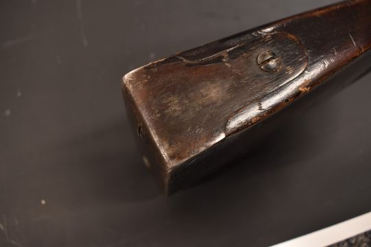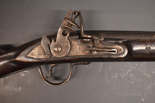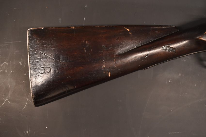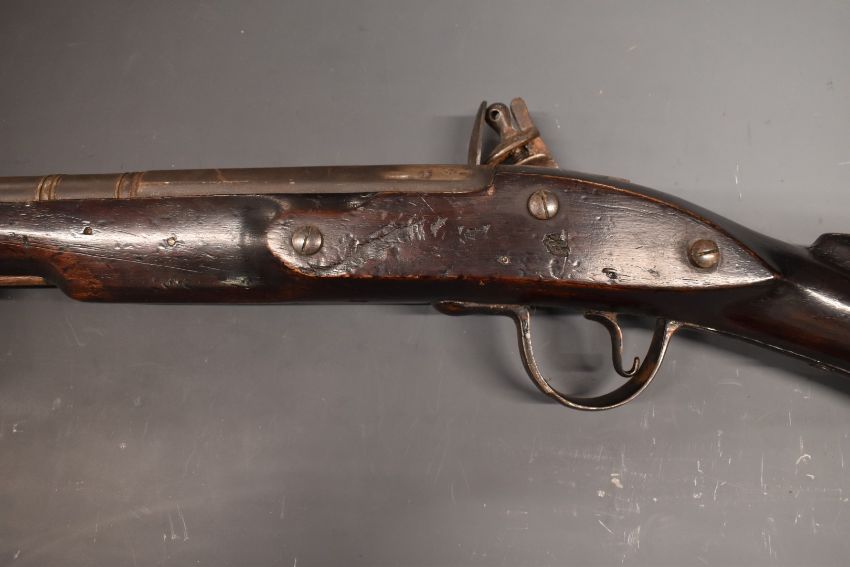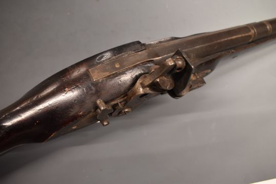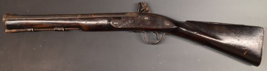 Flintlock hammer action blunderbuss with lock stamped with East India Company insignia and 1772, metal tipped wooden ram-rod, railed stock stamped 46 and 18 inch part octagonal barrel, overall length 87cm.