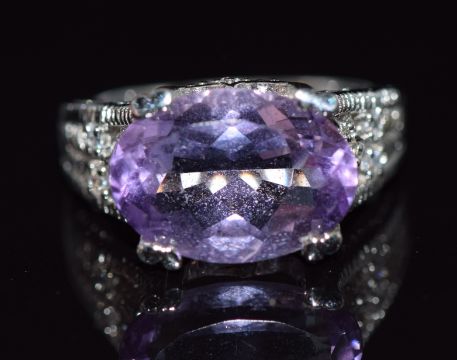 A 9k white gold ring set with an oval cut amethyst and diamonds to the shoulders and mount, 5.9g, size M/N