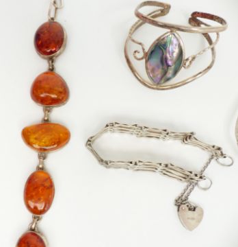 Five silver bangles, a silver gate bracelet and a pressed amber bracelet