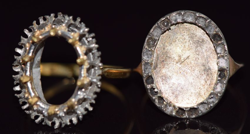 An 18ct gold ring mount ( 5g, size M) and a yellow metal Victorian ring mount 2.2g, size K