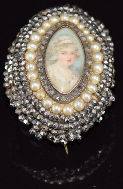 Victorian brooch set with a portrait miniature to the centre surrounded by rose cut diamonds, faux pearls and cut steel beads, 3.6 x 2.6cm