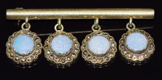 A 9ct gold bar brooch set with opal doublets and marcasite, 10.4g, 5cm long