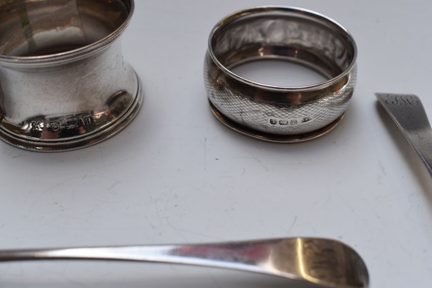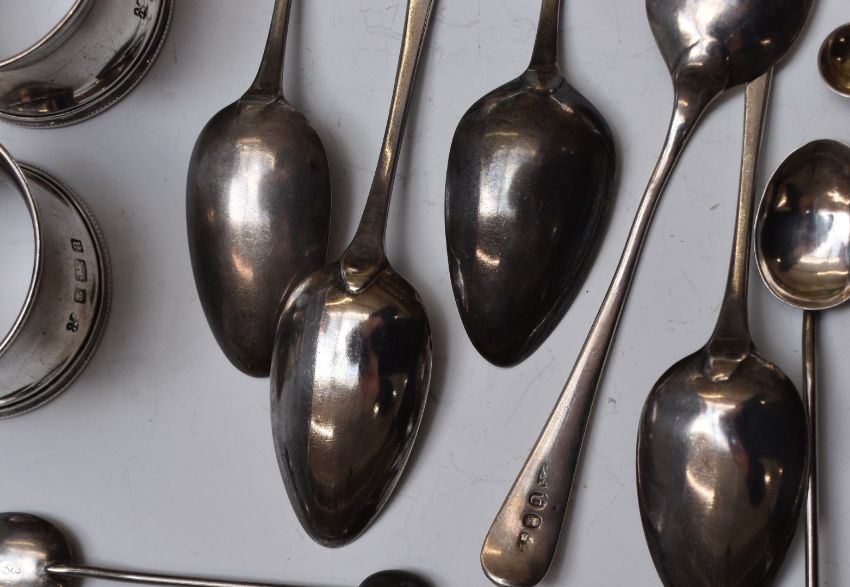 Hallmarked silver and white metal tea and other spoons and three napkin rings, Georgian and later, weight 234g